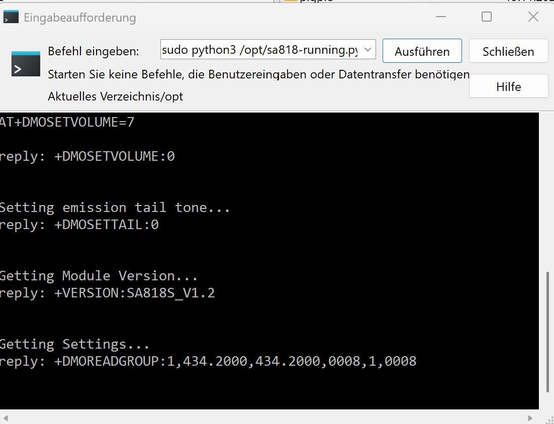Den Befehl sudo python3 /opt/sa818-running.py in das Feld recht vom Text «Befehl eingeben» eintragen und dann auf «Ausführen» klicken. Nun wird die Konfiguration wie Frequenz, CTCSS, usw. übertragen.